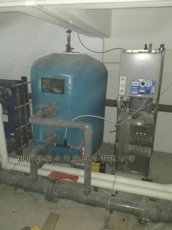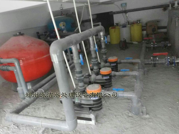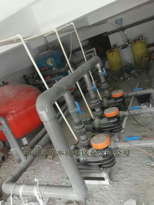 機房內(nèi)部已經(jīng)安裝完畢、次游泳池采用的是逆流式、采用的是砂缸循環(huán)過濾系統(tǒng)、臭氧反應器、板式換熱器、水箱等游泳池水處理設備