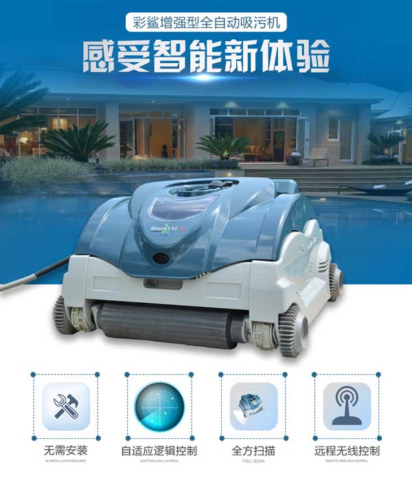 彩鯊增強型全自動吸污機可爬墻清洗泳池四周的池壁,吸污機采用紙芯過濾器、過濾精度為5微米,過濾效果好,能有效吸走池底的各類臟東西,還可以過濾水中懸浮的細小灰塵。