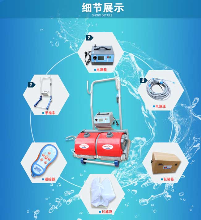 作為合格的水質(zhì)管理員應(yīng)知道泳池水處理中有一項池底清潔處理工作必須用到游泳池吸污機,也叫水下吸污機,水龜?shù),主要針對池水中的皮屑、頭發(fā)、樹葉、塵埃等臟物進(jìn)行清潔,使水清澈透明。