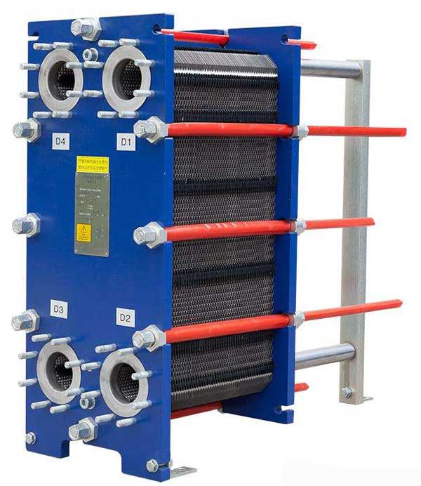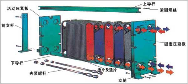 板式換熱器是由一組波紋形的平行金屬板構(gòu)成的,在板片的4個(gè)拐角出都有通道孔,板被夾緊在一個(gè)富有連接管的固定板和活動(dòng)壓緊板的框架中,并用夾緊螺栓加以夾緊。這些鏈接管同板上的通道孔對中,并與熱交換的兩種液體的外部管理相連,傳熱板和活動(dòng)壓緊板懸掛在頂部承載梁的下面并由底部橫梁使其對準(zhǔn)定位。傳熱板本身是有器有特定形狀并被固緊的電熱片密封,以防止外部泄露,并把熱交換的兩種液體按逆流方式交替地流過另一對傳熱板之間的通道內(nèi)。板片上的波紋不但提高流體的串流程度,并且形成許多接觸點(diǎn),以承受正常的運(yùn)行壓力。